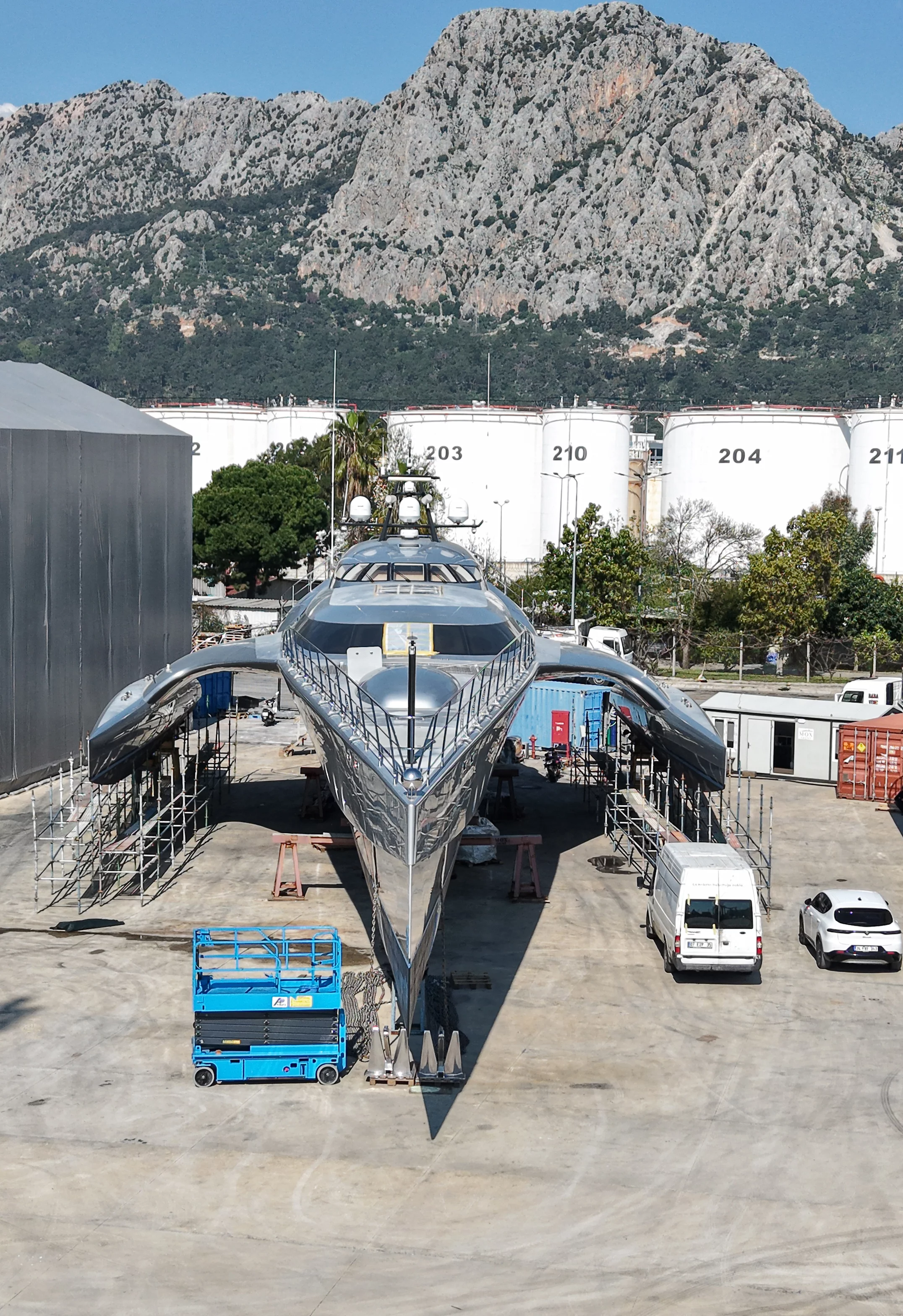 2016 yılında Letonya’da özel üretim olarak inşa edilip Birleşik Arap Emirlikleri’ne satılan 53 metre uzunluğunda ve 17 metre genişliğindeki bu özel tasarım teknelerin bakım çalışmaları yaklaşık 1 aydır sürüyor. Dalgalı denizlerde stabil kalabilmeleri için geliştirilen bu yatlar, 30 knot hıza ulaşabiliyor ve her birinin değerinin yaklaşık 33 milyon dolar olduğu ifade ediliyor.