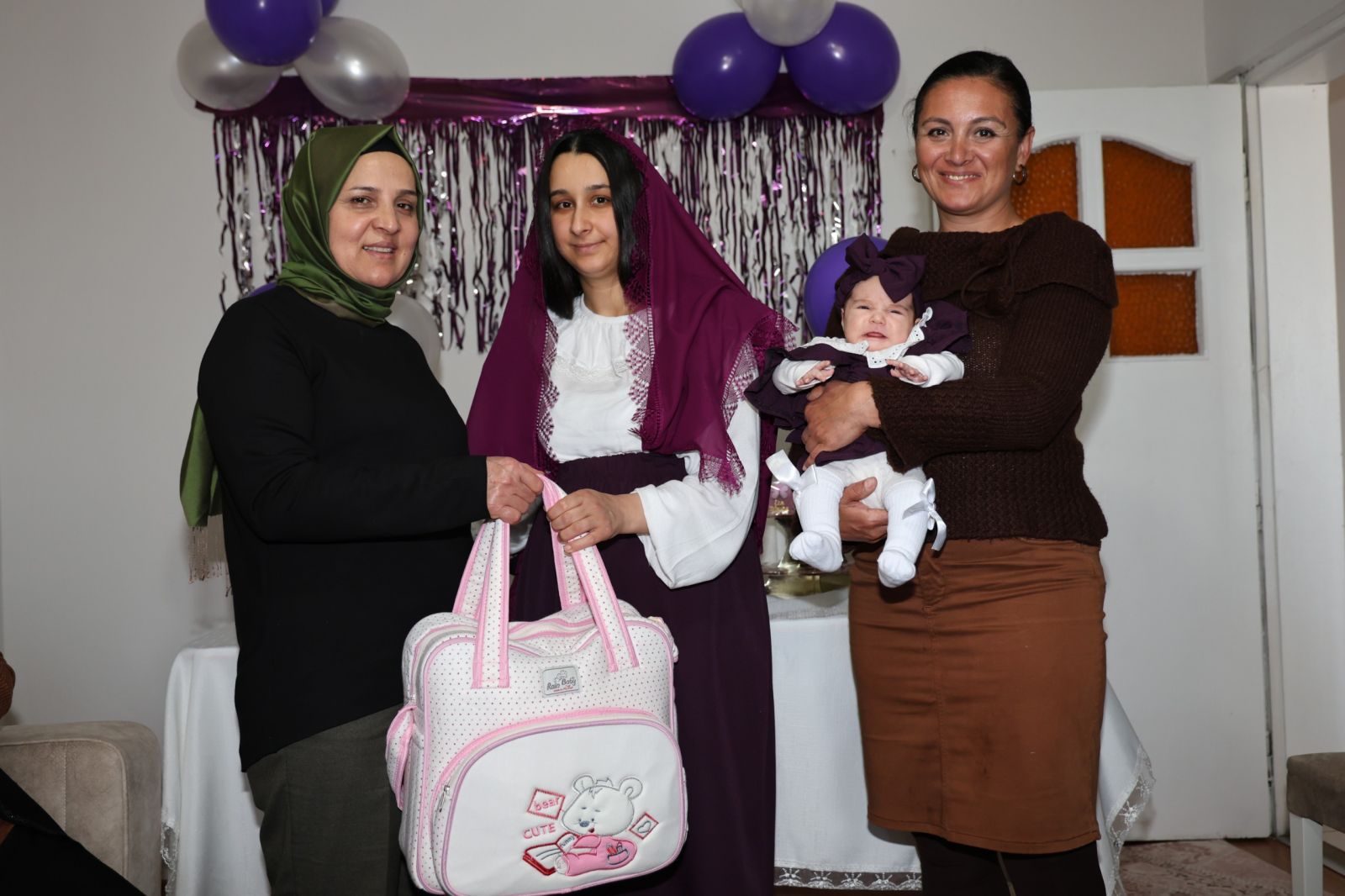 Aksu Belediye Başkanı İsa Yıldırım’ın eşi Emine Yıldırım’ın Kültür ve Sosyal Müdürü Selda Yazıcı ile birlikte gerçekleştirdiği ilk ziyarette, bebek sevinci yaşayan Kütük çifti tebrik edilerek, minik yavruları Ece Züleyha’ya yeni doğan çantası hediye edildi.