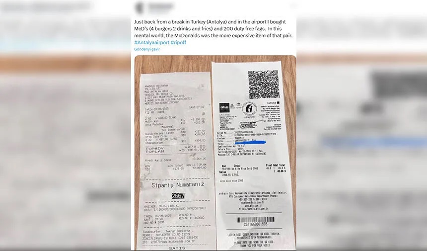 Antalya’ya tatil için gelen yabancı bir turist, havalimanında yediği yemek karşılığında ödenen faturayı sosyal medya üzerinden paylaşarak tepkisini dile getirdi. Turist, 4 hamburger, 2 içecek ve 1 patates kızartması için 3 bin TL, ayrıca aldığı sigara için 48 euro (2 bin 242 TL) ödedi. Sosyal medya paylaşımında, “Türkiye’de (Antalya) havaalanında yemek ve sigara aldım. Bu ikiliden en pahalısı yemek oldu” ifadelerini kullandı.