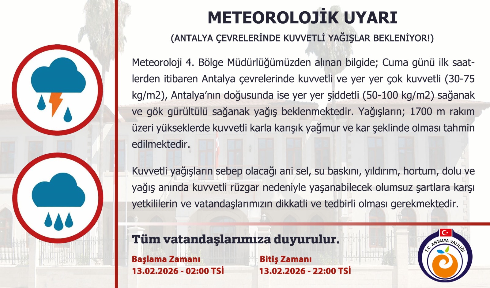 Antalya Valiliği, 13 Şubat 2026 Cuma günü kent genelinde kuvvetli ve yer yer çok kuvvetli sağanak yağış beklendiğini açıkladı. Yetkililer, sel, su baskını, hortum ve dolu riskine karşı vatandaşları uyardı.