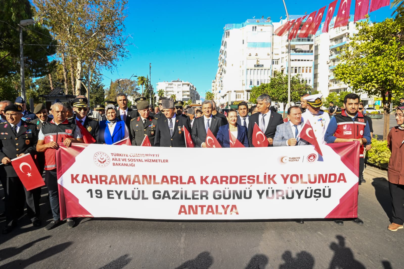 Cumhuriyet Caddesinde Kahramanlarla Kardeşlik Yolunda Gaziler Günü Yürüyüşüyle başladı. Cumhuriyet Meydanı'nda bulunan Atatürk Anıtı'na çelenk sunumuyla devam eden törene, Antalya Valisi Hulusi Şahin, Antalya Cumhuriyet Başsavcısı Yakup Ali Kahveci, Garnizon Komutanı Tümgeneral Sinan Eren, Antalya Büyükşehir Belediye Başkan Vekili Büşra Özdemir, Antalya Emniyet Müdürü Sabit Akın Zaimoğlu, Antalya İl Jandarma Komutan Yardımcısı Albay Ali Uslu, Türkiye Muharip Gaziler Derneği Antalya Şube Başkanı Zeynel Abidin Sezer, siyasiler, askerler, güvenlik güçleri, gaziler ve vatandaşlar katıldı.