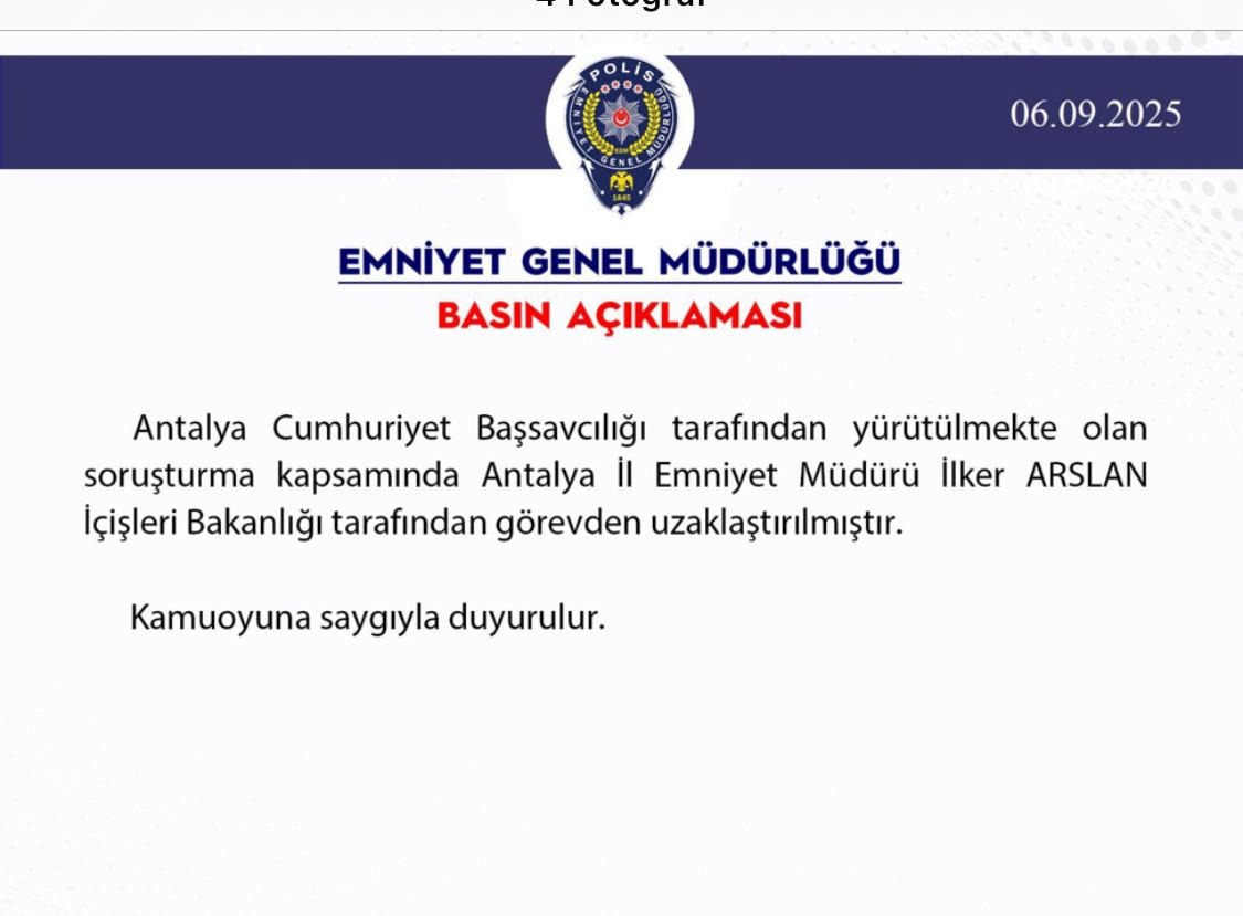 Antalya’da gündemi sarsan bir gelişme yaşandı. Büyükşehir Belediyesi’ne yönelik yürütülen soruşturma kapsamında, Antalya İl Emniyet Müdürü İlker Arslan, İçişleri Bakanlığı tarafından görevden uzaklaştırıldı.