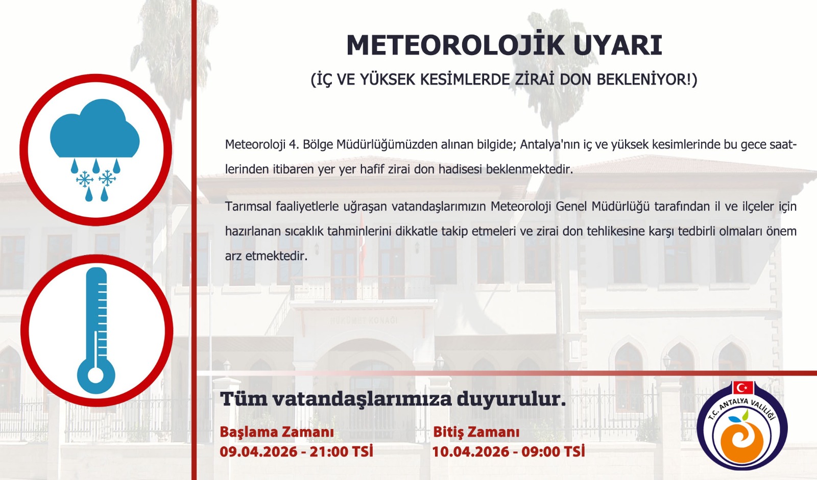 Antalya Valiliği, Meteoroloji 4. Bölge Müdürlüğü’nden alınan son veriler doğrultusunda kent genelinde önemli bir uyarıda bulundu. Yapılan açıklamaya göre, 9 Nisan Perşembe saat 21.00 ile 10 Nisan Cuma saat 09.00 arasında iç ve yüksek kesimlerde yer yer hafif zirai don bekleniyor.