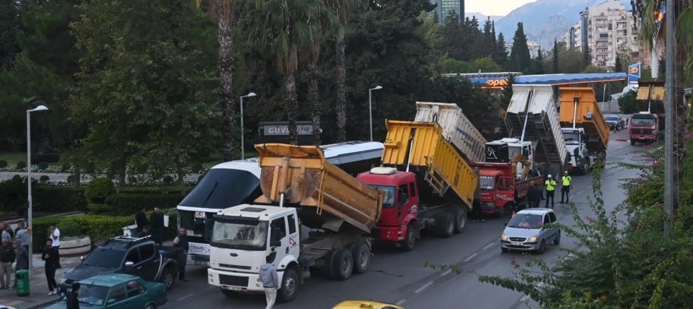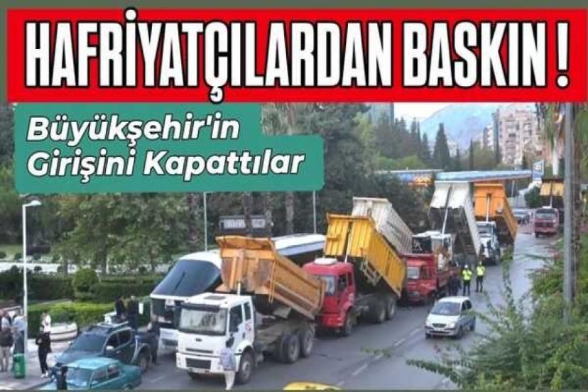 Geçtiğimiz günlerde Antalya Büyükşehir Belediyesi tarafından ceza kesilen hafriyatçılar ayaklandı. Sabahın erken saatlerinde çok sayıda hafriyatçı, kamyonlarıyla birlikte Antalya Büyükşehir Belediyesi binası önünde eylem yaptı.