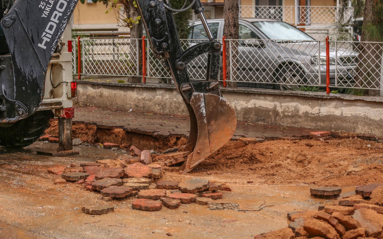 Yenileme çalışması kapsamında caddenin her iki yönündeki kaldırımda kırılan, hizmet veremez hale gelen kilit taşları ve bordürler, iş makinesi yardımıyla söküldü. Daha sonra bu taşlar, kamyonlar aracılığıyla altyapı malzemesi haline getirileceği belediyenin geri dönüşüm tesisine taşındı.