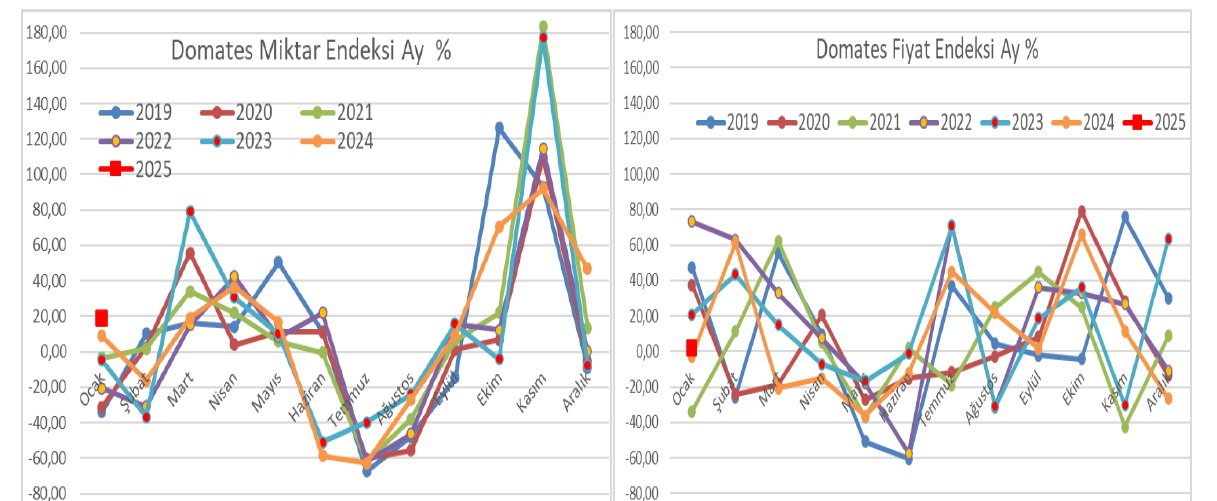 Ocak ayında endekslerdeki yıllık değişimler; miktarda domates için ortalama üstünde, sebze ve meyve için ise 10 yıllık ortalama altında kaldı. Yıllık fiyat endekslerindeki değişimler, domates, sebze ve meyve için ortalama üstünde gerçekleşti.