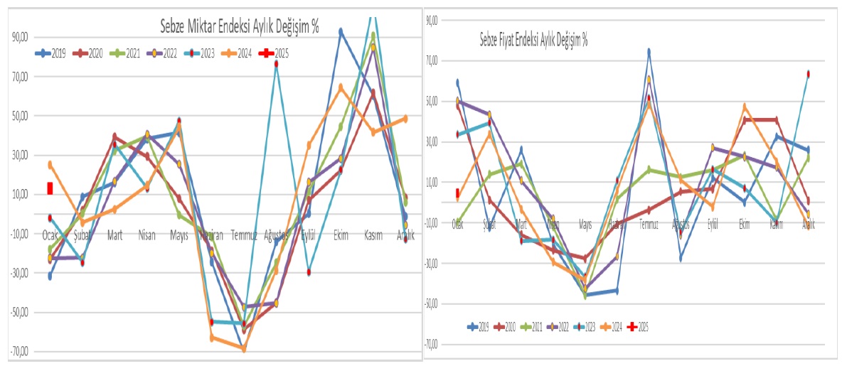 Bir önceki aya göre (aylık) sebze işlem miktar endeksi, Ocak ayında yüzde 13.08 artış göstermesine karşılık işlem fiyat endeksi de aylık yüzde 4.81 arttı. Son 7 yılın Ocak ayları dikkate alındığında sebze miktar endeksinde en yüksek ikinci artış ve fiyat endeksinde ise en düşük ikinci artış gerçekleşti.