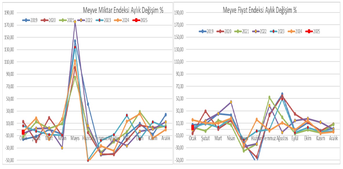 Son 7 yılın Ocak ayları dikkate alındığında aylık değişimler, meyve miktar ve fiyat endekslerinde ortalama altı değişimler olarak gerçekleşti.
