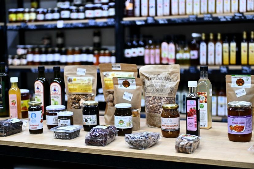 Mağaza raflarında erişte, reçel, pekmez, sirke, tarhana gibi doğal ürünlerin yanı sıra coğrafi işaretli Tavşan Yüreği zeytini ve el emeği hediyelik eşyalar da yer alıyor.