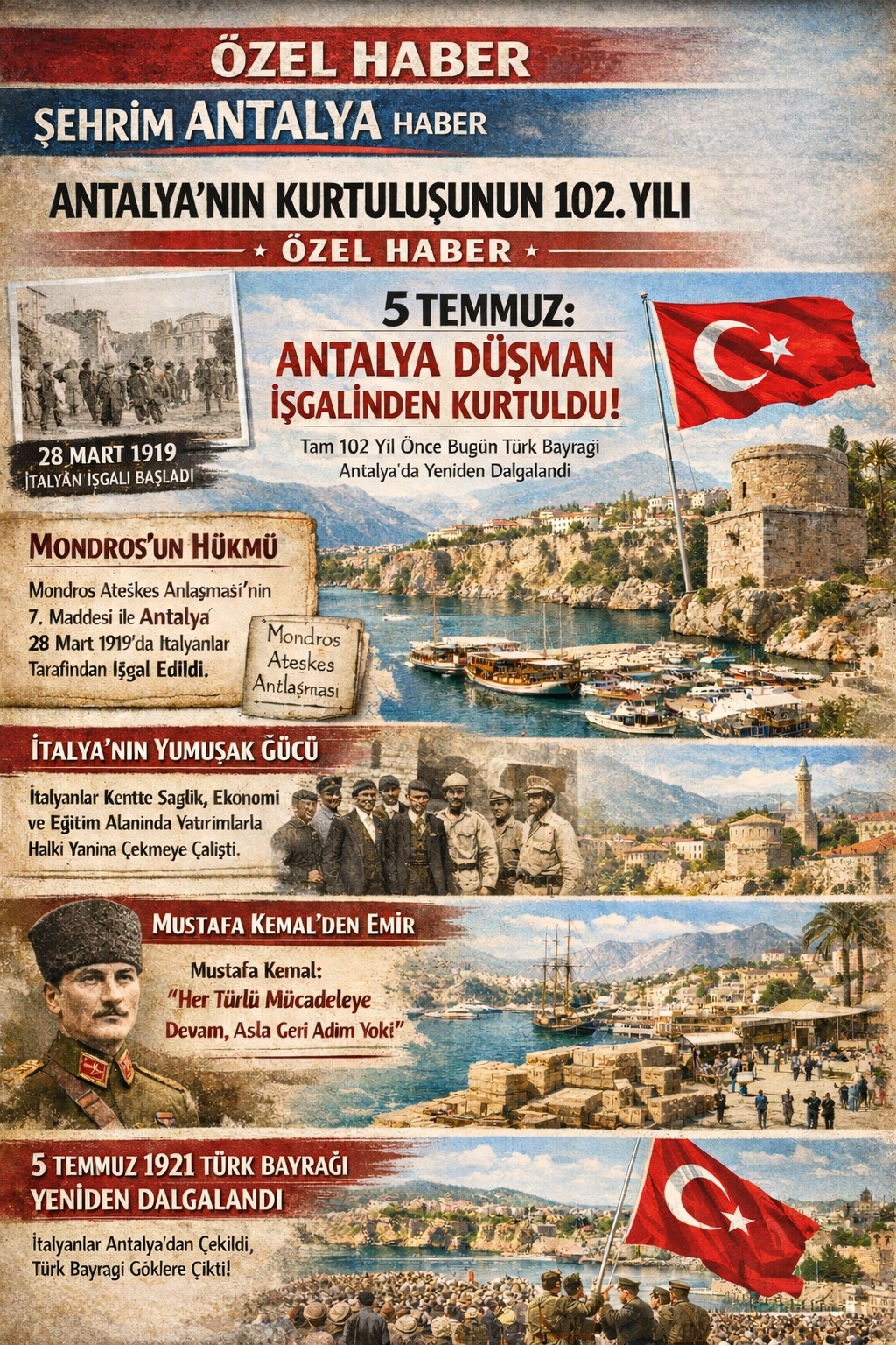 Antalya, 28 Mart 1919’da İtalya tarafından işgal edildi ve 5 Temmuz 1921’de özgürlüğüne kavuştu. Kentte doğrudan cephe savaşı yaşanmadı; ancak Antalya, Milli Mücadele’nin en kritik lojistik merkezlerinden biri haline geldi. İşgalin hukuki dayanağı Mondros Ateşkes Antlaşması’nın 7’nci maddesi olurken, Mustafa Kemal Atatürk’ün kararlı duruşu direnişin seyrini belirledi.