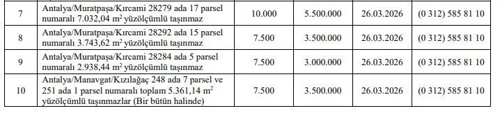 Özelleştirme İdaresi Başkanlığı, Antalya’da Muratpaşa Kırcami ve Manavgat Kızılağaç’ta bulunan kamuya ait taşınmazları satışa çıkarıyor. Toplam 4 ayrı taşınmaz için son teklif tarihi 26 Mart 2026 olarak açıklandı.