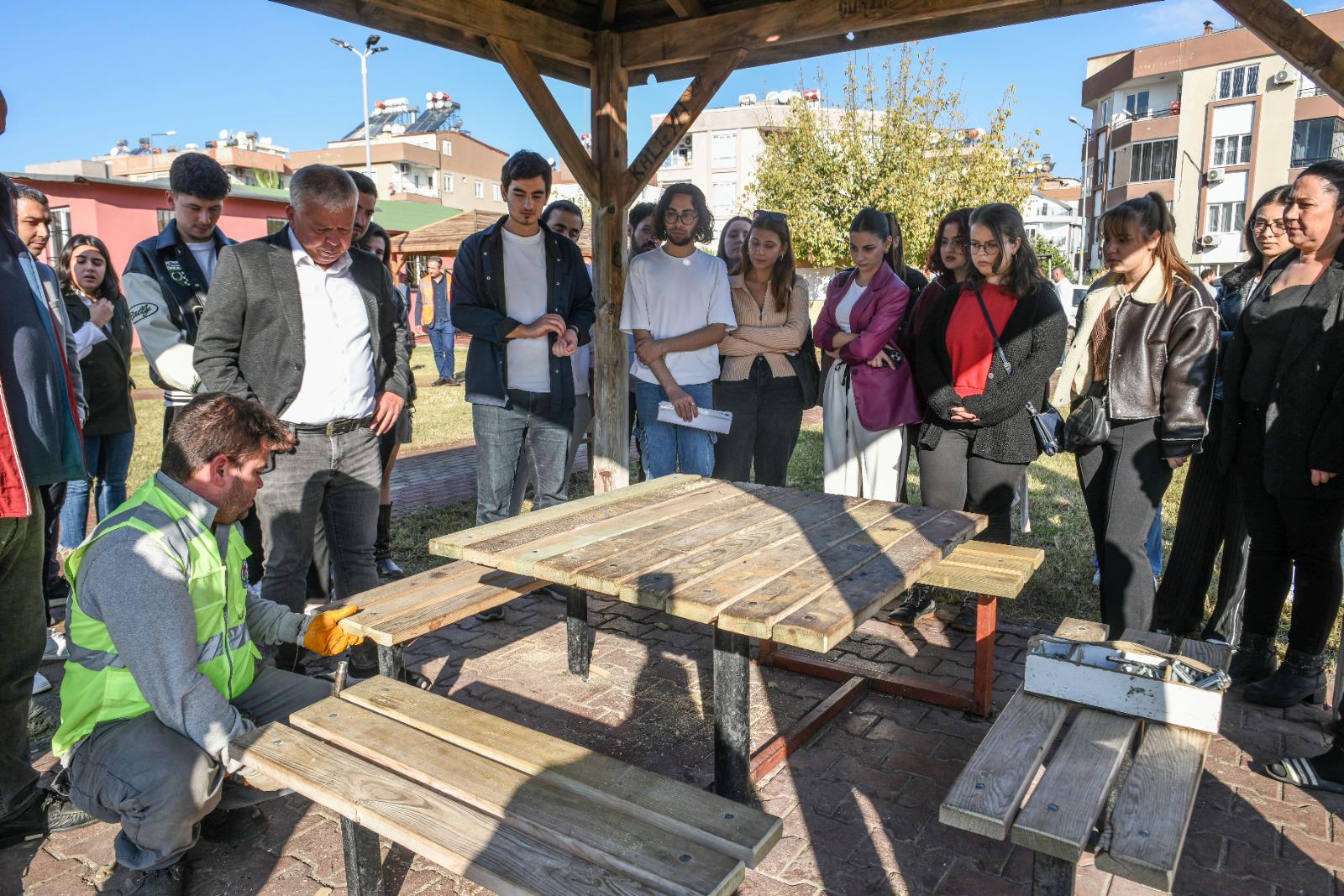 Kepez Belediye Başkanı Mesut Kocagöz’ün misafir ettiği öğrenciler, ‘Kent Mobilyaları Dersi’ için park yenileme çalışmasını inceledi. İç Mimarlık Bölümü Öğretim Görevlisi Abdullah Hikmet Başaytaç, öğrencilerin derslerini uygulamaları olarak sahada görmeleri için bu geziyi düzenlediklerini söyledi. İç Mimarlık ve Peyzaj Mimarlığı öğrencilerinin, anketler aracılığıyla kentlinin neye ihtiyacı olduğunu, memnuniyetlerinin ne olduğu, nelerle ilgili yenilenme ya da değişim göstereceği konusunda park ve meydanlar üzerine bir çalışma yaptığını aktaran Başaytaç, “Kepez Belediyesi Park ve Bahçeler Müdürlüğü’nün atölyesini de ziyaret ederek, kent mobilyalarının tasarımını yerinde gördüler. Park tadilat çalışmasını yerinde takip ederek, uygulanan projenin onarım sürecinde yaşanacak durumlar ve bunun çözümüyle ilgili bilgi aldılar” ifadesini kullandı.