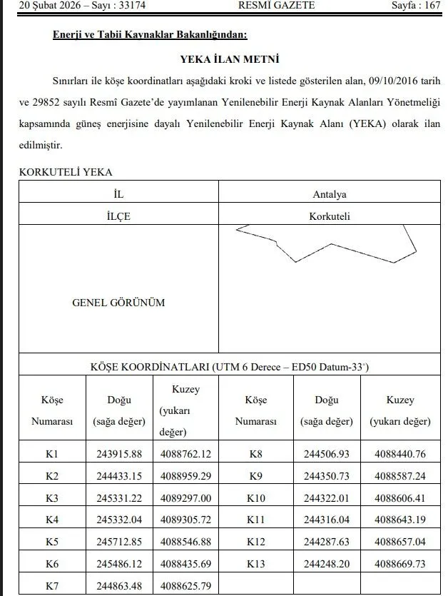 Enerji ve Tabii Kaynaklar Bakanlığı tarafından alınan kararla, Korkuteli sınırları içinde belirlenen bir alan güneş enerjisine dayalı Yenilenebilir Enerji Kaynak Alanı (YEKA) ilan edildi. Şubat 2026 tarihli Resmî Gazete’de yayımlanan ilanla birlikte söz konusu arazi, enerji üretimi amacıyla özel statüye alındı.