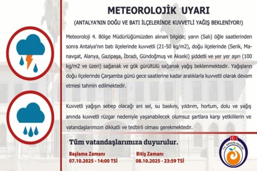 Antalya Valiliği ise Meteoroloji 4. Bölge Müdürlüğü’nden alınan bilgiye dayanarak, özellikle Salı günü öğleden sonra batı ilçelerde kuvvetli (21-50 kg/m²), doğu ilçelerde ise şiddetli ve yer yer aşırı yağışların (100 kg/m² ve üzeri) beklendiğini duyurdu.