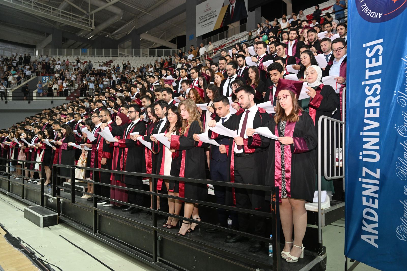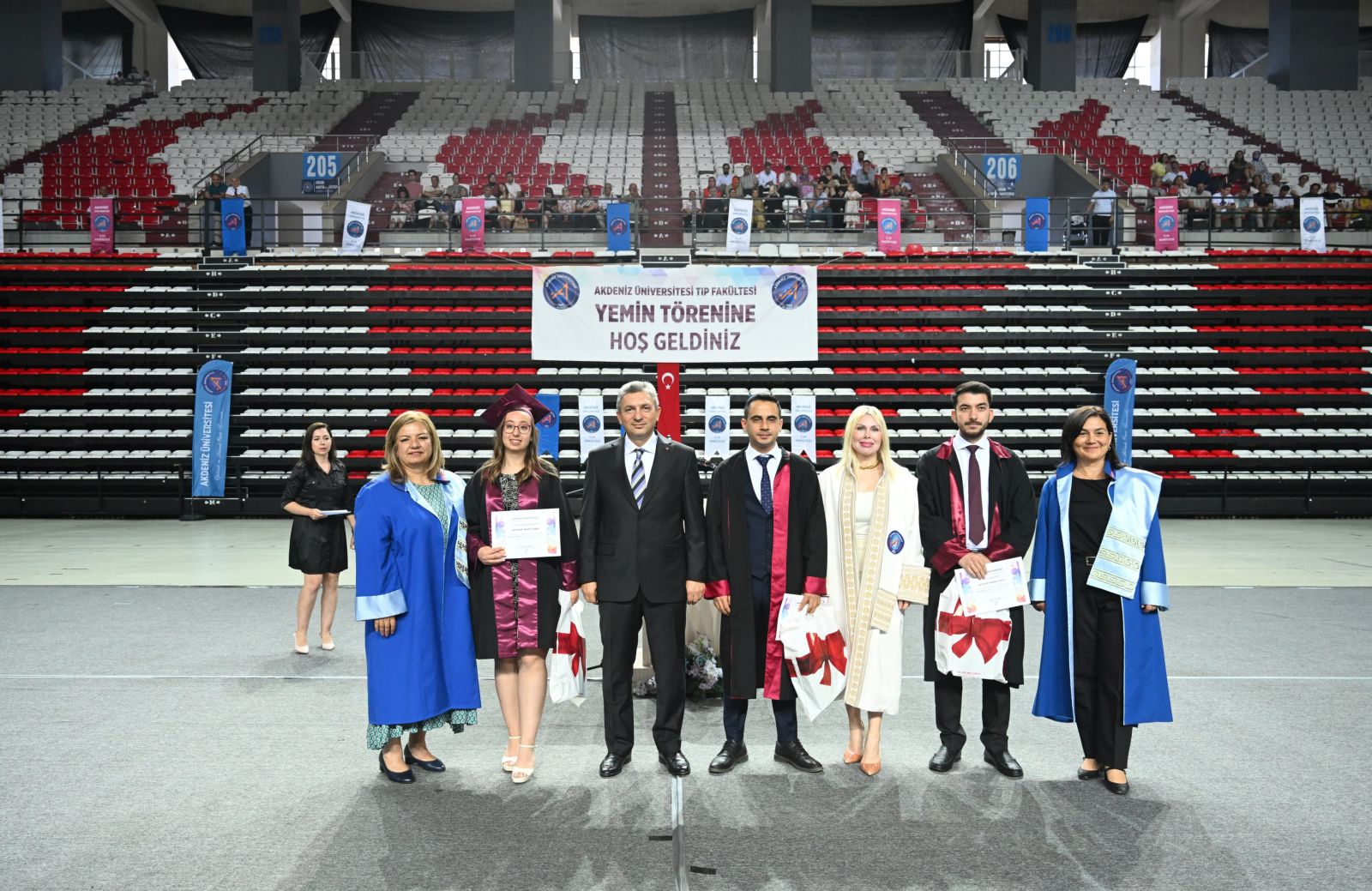 Akdeniz Üniversitesi Tıp Fakültesi 2024-2025 Akademik Yılı Yemin Töreni, Antalya Valisi Hulusi Şahin’in katılımıyla gerçekleştirildi. 6 yıllık eğitim ve öğretim sürecini başarıyla tamamlayan 286 öğrenci hekimlik andını okuyarak doktorluk mesleğine ilk adımı attı. Antalya Kapalı Spor Salonu’nda gerçekleştirilen törene Vali Hulusi Şahin, Akdeniz Üniversitesi Rektörü Prof. Dr. Özlenen Özkan, rektör yardımcıları, akademisyenler, STK temsilcileri ile öğrenciler ve aileleri katıldı.