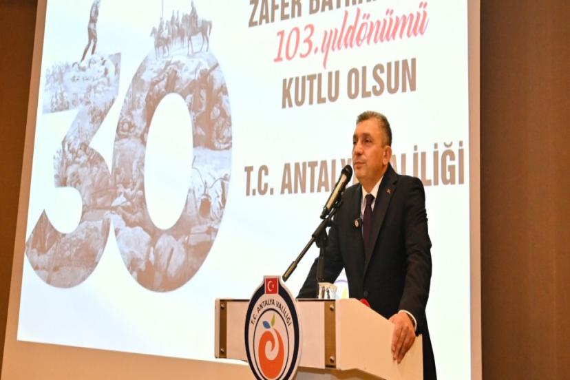 30 Ağustos Zafer Bayramı'nın 103. yıl dönümü dolayısıyla Antalya Valiliği tarafından Zafer Bayramı Resepsiyonu düzenlendi. Antalya Valisi Hulusi Şahin ve eşi Ebru Şahin’in ev sahipliğinde gerçekleşen resepsiyona; Antalya Milletvekilleri, Büyükşehir Belediye Başkan Vekili Büşra Özdemir, Akdeniz Üniversitesi Rektörü Prof. Dr. Özlenen Özkan, Vali yardımcıları, Kaymakamlar, İlçe Belediye Başkanları, Dişişleri Bakanlığı Antalya Temsilcisi Deha Erpek,