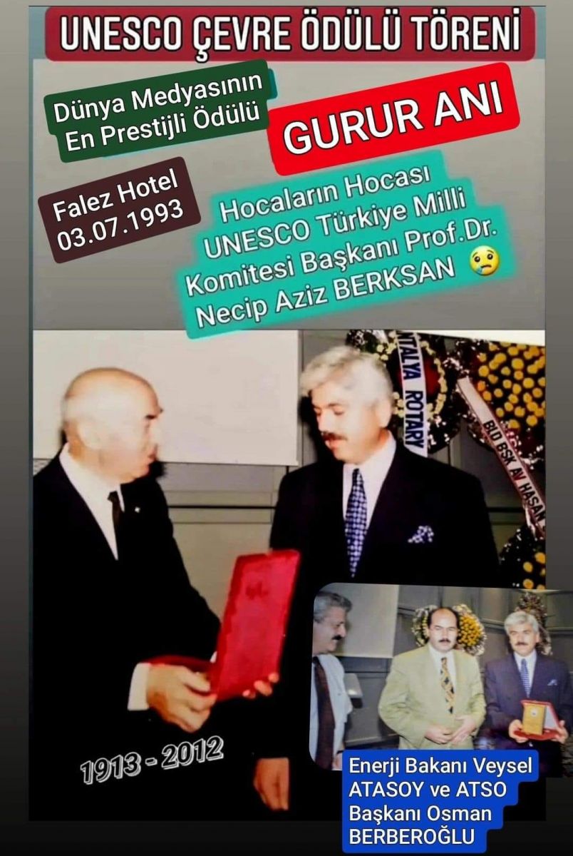 14- Antalya'nın değerlerinin korunması ve çevresel konulardaki başarıları ile (Türkiye'de ilk ve tek) Uluslararası UNESCO Çevre Ödülüne layık görülen gazeteci olarak.