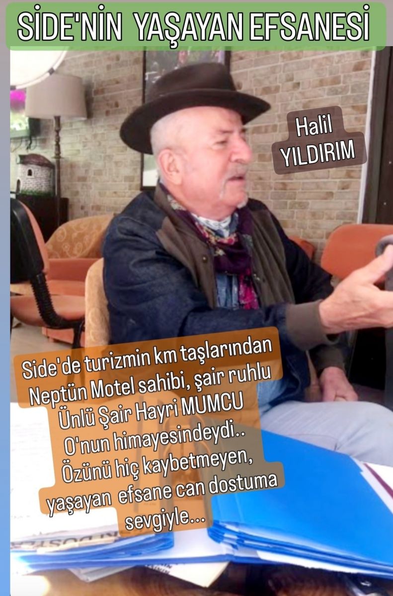 Hayatını Side’nin antik dünyası içinde can dostu Neptün Motel'in sahibi Halil Yıldırım'ın himayesinde geçiren, kendi halinde, dost meclislerinin aranılan ismi olarak efsaneleşti Hayri Mumcu…