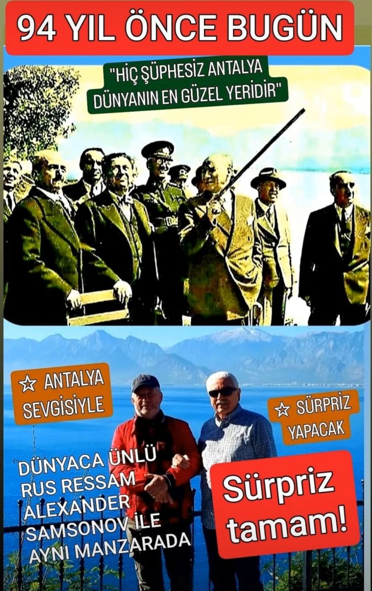 Valimiz Hulusi Şahin’in hayal ettiği, Eşsiz Atamızın: "Hiç Şüphe Yok ki Antalya Dünyanın En Güzel Yeridir" sözünü söylediği yerde çekilen, tarihi anın fotoğrafını yağlı boya tablo yapılması ve makama asılması ile ilgili görevi gururla üstlendim...
